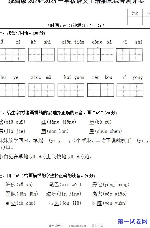 当前位置:免费教育资源网 → 下载 → 语文试题 → 一年级→ 统编版2024-2025一年级语文上册期末综合测评卷 免费下载