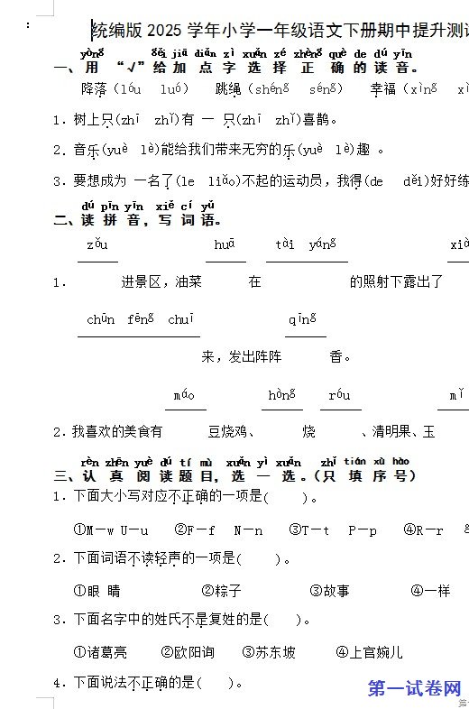 当前位置:免费教育资源网 → 下载 → 语文试题 → 一年级→ 统编版2025学年小学一年级语文下册期中提升测试 免费下载
