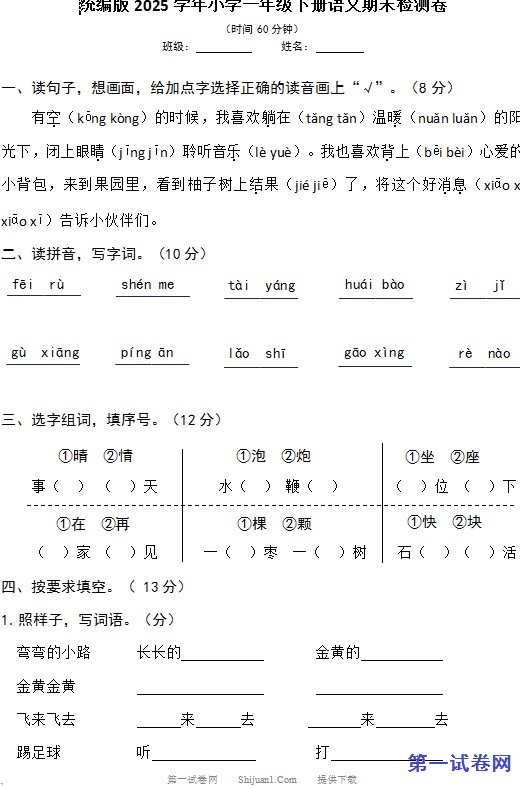 当前位置:免费教育资源网 → 下载 → 语文试题 → 一年级→ 统编版2025学年小学一年级下册语文期末检测卷 免费下载