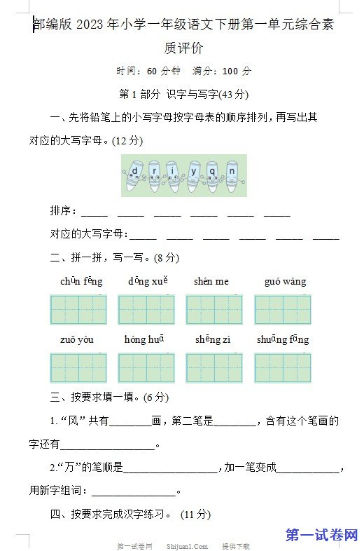 当前位置:免费教育资源网 → 下载 → 语文试题 → 一年级→ 部编版2023年小学一年级语文下册第一单元综合素质评价 免费下载