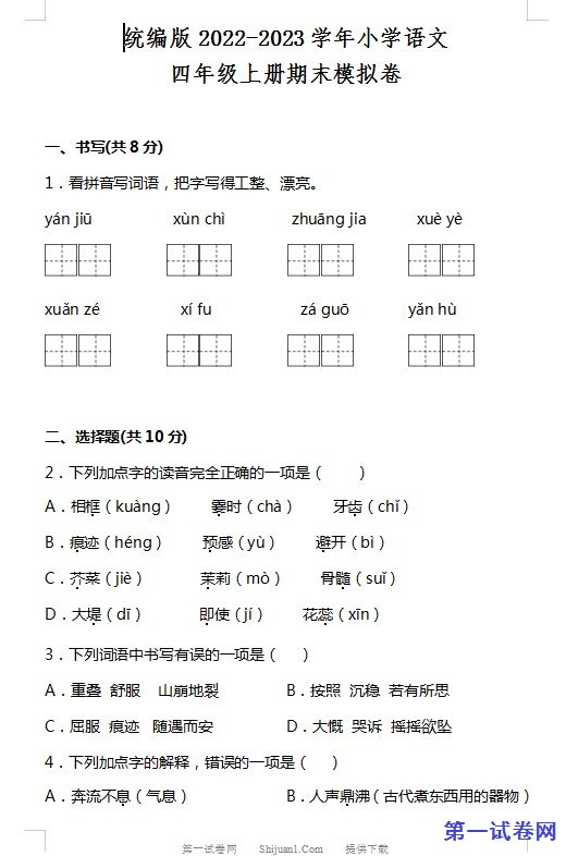 当前位置:免费教育资源网 → 下载 → 语文试题 → 四年级→ 部编版2022-2023学年四年级语文上册期末模拟试卷 免费下载