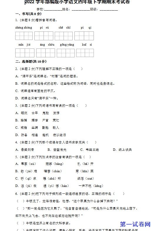 当前位置:免费教育资源网 → 下载 → 语文试题 → 四年级→ 2022学年部编版小学语文四年级下学期期末考试卷 免费下载