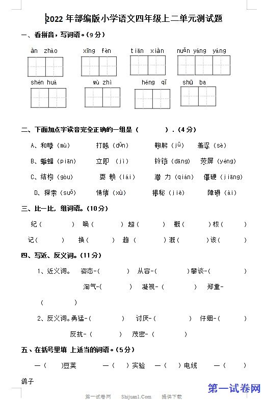 当前位置:免费教育资源网 → 下载 → 语文试题 → 四年级→ 2022年部编版小学语文四年级上二单元测试题 免费下载