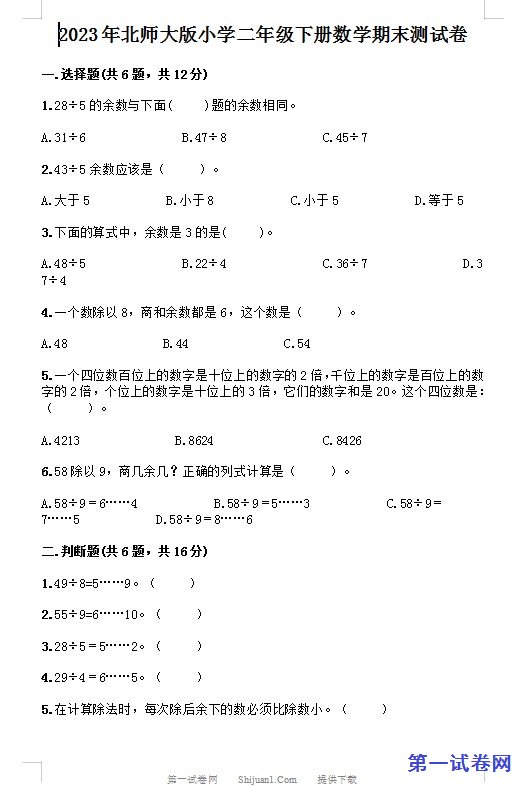 当前位置:免费教育资源网 → 下载 → 数学试题 → 初中与小学试题 → 小学二年级→ 2023年北师大版小学二年级下册数学期末测试卷 免费下载