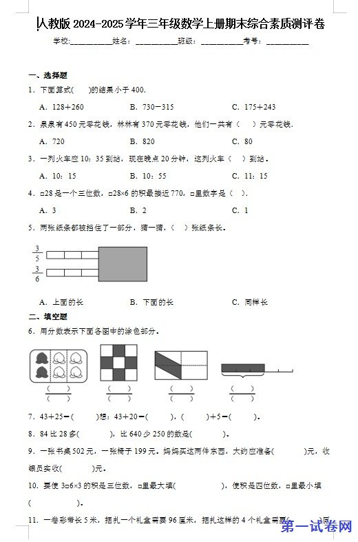 当前位置:免费教育资源网 → 下载 → 数学试题 → 初中与小学试题 → 小学三年级→ 人教版2024-2025学年三年级数学上册期末综合素质测评卷 免费下载