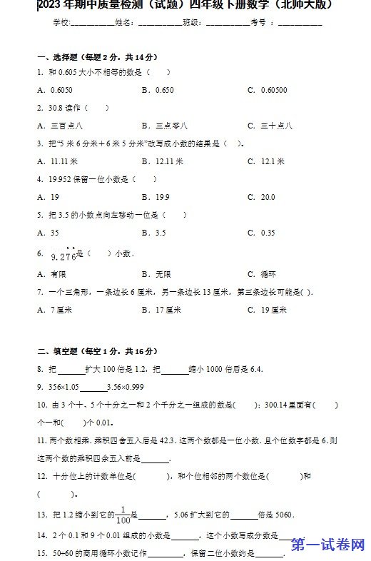 当前位置:免费教育资源网 → 下载 → 数学试题 → 初中与小学试题 → 小学四年级→ 2023年期中质量检测(试题)四年级下册数学(北师大版) 免费下载