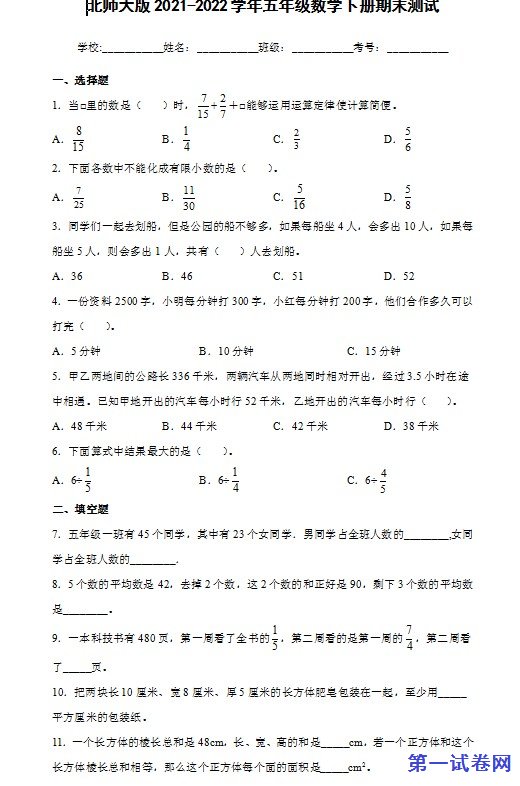 当前位置:免费教育资源网 → 下载 → 数学试题 → 初中与小学试题 → 小学五年级→ 北师大版2021-2022学年五年级数学下册期末测试 免费下载