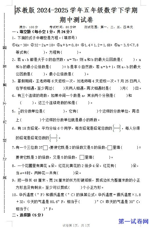 当前位置:免费教育资源网 → 下载 → 数学试题 → 初中与小学试题 → 小学五年级→ 苏教版2024-2025学年五年级数学下学期期中测试卷 免费下载