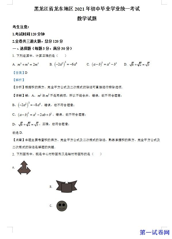 当前位置:免费教育资源网 → 下载 → 数学试题 → 中考试题→ 黑龙江省龙东地区2021年中考数学真题(解析版) 免费下载