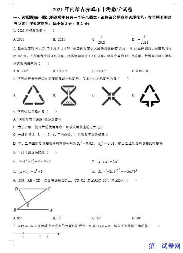当前位置:免费教育资源网 → 下载 → 数学试题 → 中考试题→ 内蒙古赤峰市2021年中考数学真题(原卷版) 免费下载