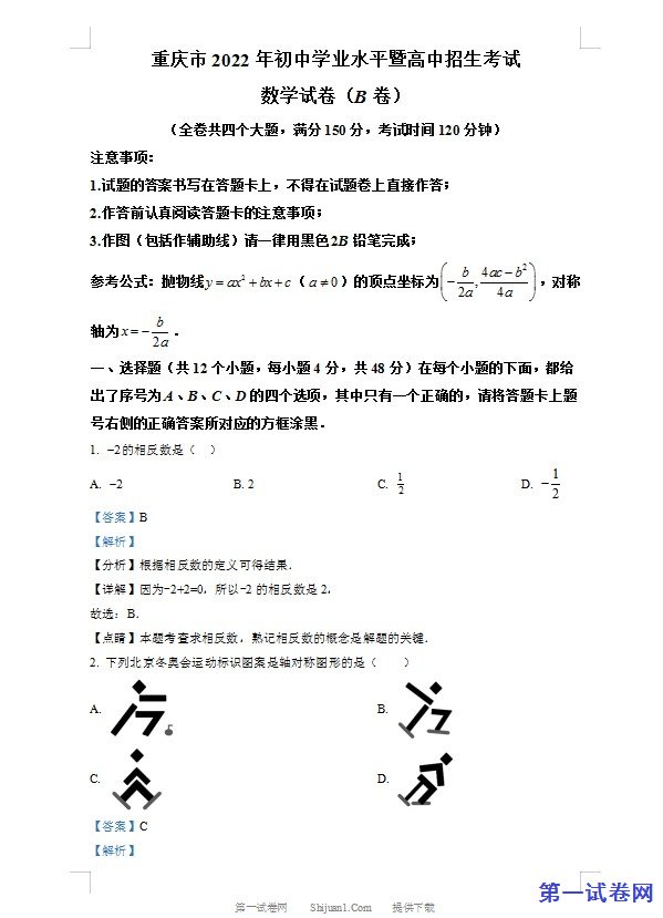 当前位置:免费教育资源网 → 下载 → 数学试题 → 中考试题→ 2022年重庆市中考数学真题(B卷)(解析版) 免费下载