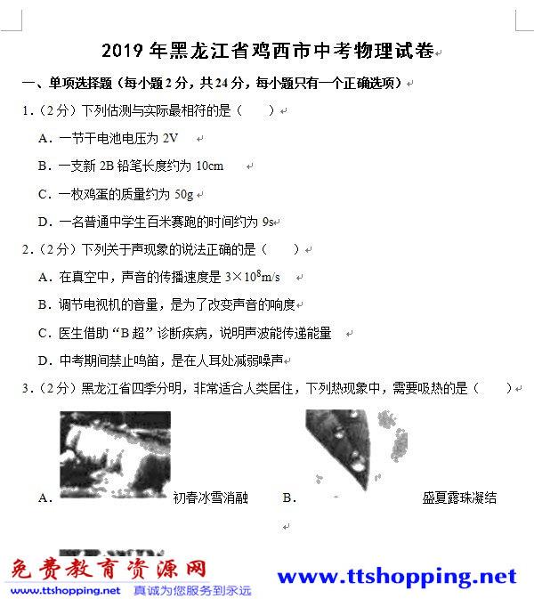 当前位置:免费教育资源网 → 下载 → 物理试题 → 中考试题→ 2019年黑龙江省鸡西市中考物理试卷(word版 含答案) 免费下载