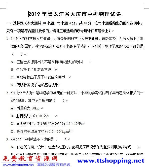 当前位置:免费教育资源网 → 下载 → 物理试题 → 中考试题→ 2019年黑龙江省大庆市中考物理试题(word版,含解析) 免费下载