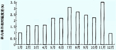 计算林内外相对湿度差值百分率(图 3)进一步表明,林内相对湿度全年高于林外,尤其是在伏旱严重的 7、 8 月份和干旱的 11 月,其差值百分率均在 2.7% 以上,越是干旱时段森林的增湿作用越为明显。