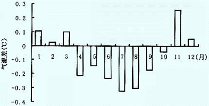 计算林内外气温差值表明,一般林内外气温差可达 0.1~0.3℃,1~5 月和 10~12 月林内外气温差别相对小,6~9 月差别相对较大,即在林木生长旺季,林内温度比林外低约 1%,其它月份差别一般在 1% 以下。11~3 月林内气温高于林外,即在低温条件下森林可以提高热效应;而 4~9 月林内低于林外,高温时段森林可进行温度调节,利用这一特点可在林内种植不耐高温的牧草或经济作物(图 4)。对历年林内外气温比较还可以看出,近年来在生长旺季,林内比林外温度低的趋势增大:由低 0.27% 增大到低 1.16%。原因是随着树木长大,森林对温度的调节效应增强,即随着林木成长,林内气温越来越低于林外,表明成龄林对温度具有更大的调节作用。