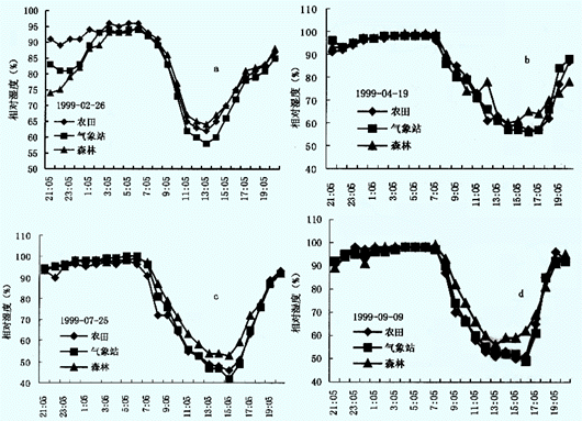 林内外相对湿度有较明显的日变化规律,林内夜间相对湿度很高,近达 100%,日出前常出现一较高值,日出后湿度迅速下降,在气温最高、太阳辐射最强时,相对湿度最低,日落时湿度又迅速上升。冬季在 9:00-20:00、夏季在 4:00-16:00、春季和秋季几乎全天林内相对湿度高于林外,表明森林具有调节湿度增加水汽的作用,这一点尤其是在日内水分容易亏缺的中午前后更有意义。