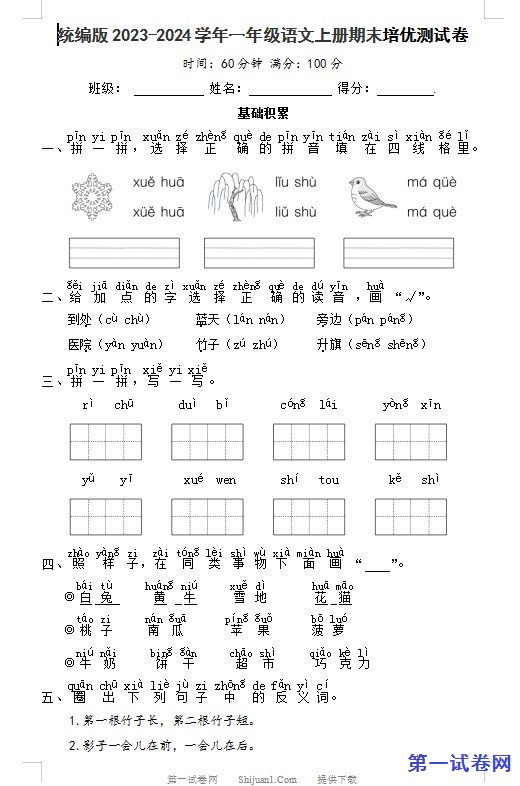 当前位置:免费教育资源网 → 下载 → 语文试题 → 一年级→ 统编版2023-2024学年一年级语文上册期末培优测试卷 免费下载