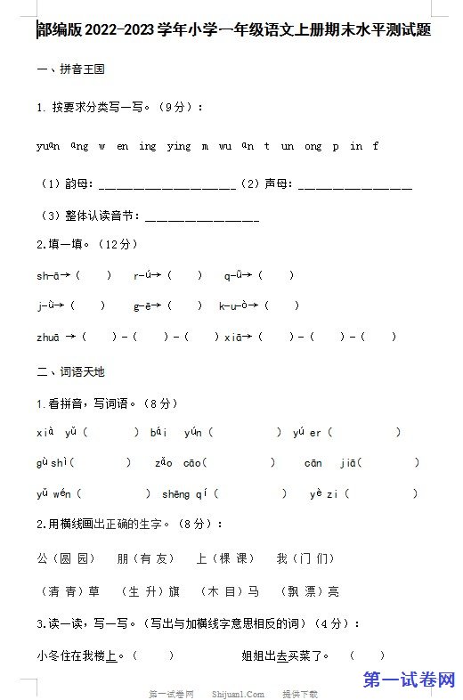 当前位置:免费教育资源网 → 下载 → 语文试题 → 一年级→ 部编版2022-2023学年小学一年级语文上册期末水平测试题 免费下载