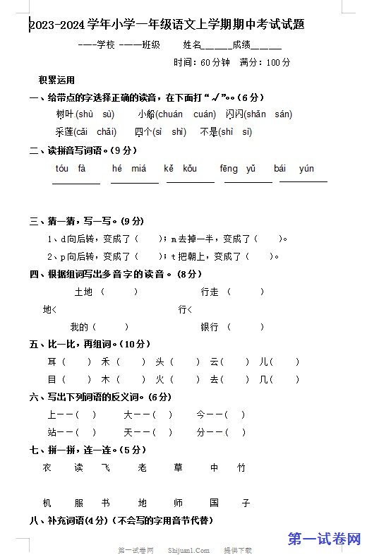 当前位置:免费教育资源网 → 下载 → 语文试题 → 一年级→ 2023-2024学年小学一年级语文上学期期中考试试题 免费下载