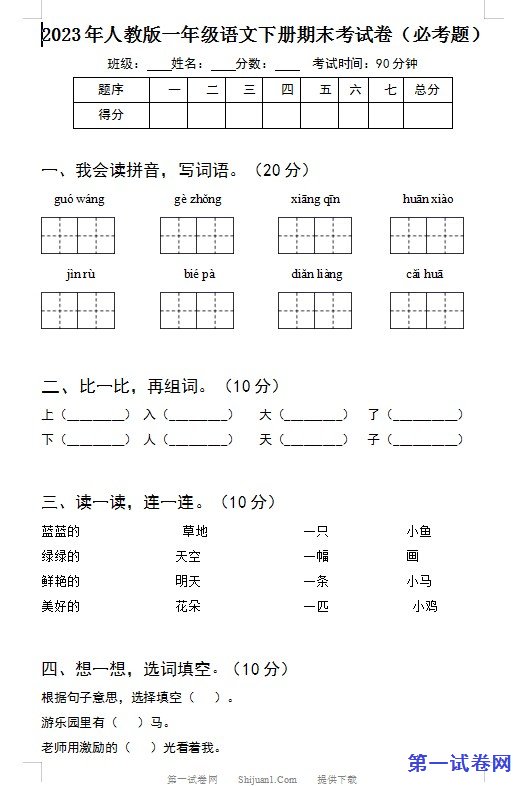 当前位置:免费教育资源网 → 下载 → 语文试题 → 一年级→ 2023年人教版一年级语文下册期末考试卷(必考题) 免费下载