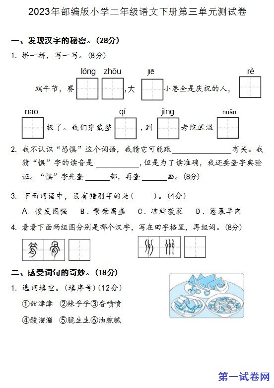 当前位置:免费教育资源网 → 下载 → 语文试题 → 一年级→ 2023年部编版小学二年级语文下册第三单元测试卷 免费下载