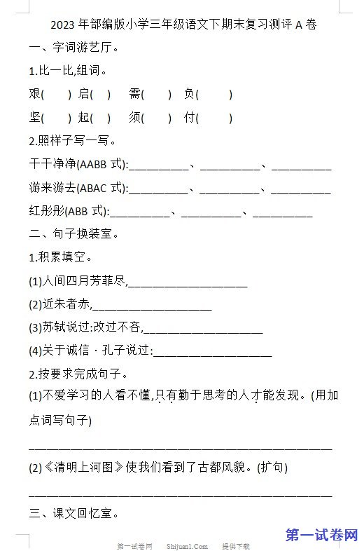 当前位置:免费教育资源网 → 下载 → 语文试题 → 三年级→ 2023年部编版小学三年级语文下期末复习测评 免费下载