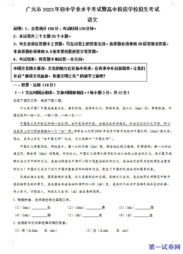 当前位置:免费教育资源网 → 下载 → 语文试题 → 初中与小学试题 → 中考真题→ 2023年四川省广元市中考语文真题(原卷版) 免费下载