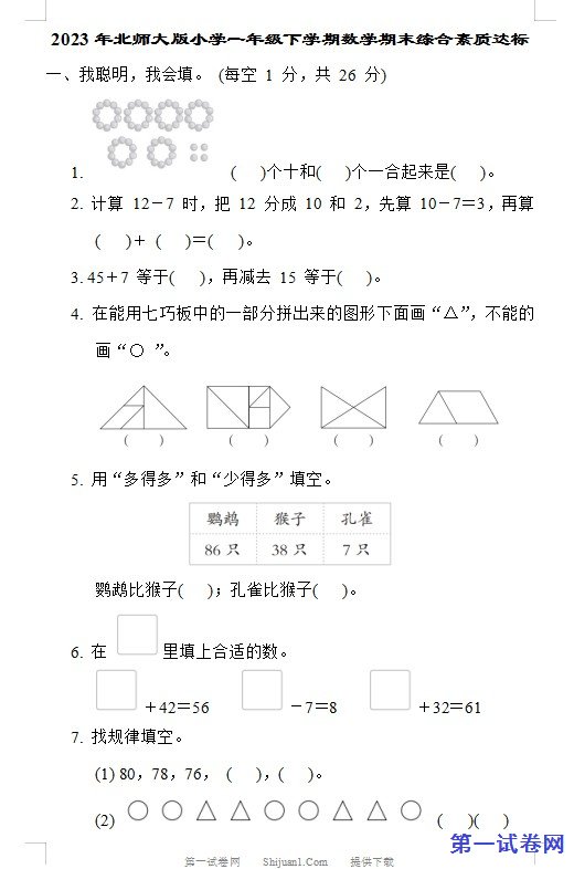 当前位置:免费教育资源网 → 下载 → 数学试题 → 初中与小学试题 → 小学一年级→ 2023年北师大版小学一年级下学期数学期末综合素质达标 免费下载