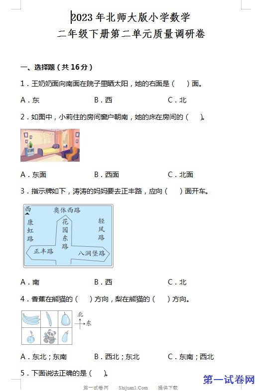 当前位置:免费教育资源网 → 下载 → 数学试题 → 初中与小学试题 → 小学二年级→ 2023年北师大版二年级数学下册第二单元测试卷 免费下载