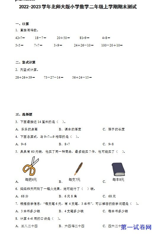 当前位置:免费教育资源网 → 下载 → 数学试题 → 初中与小学试题 → 小学二年级→ 2022-2023学年北师大版小学数学二年级上学期期末测试 免费下载