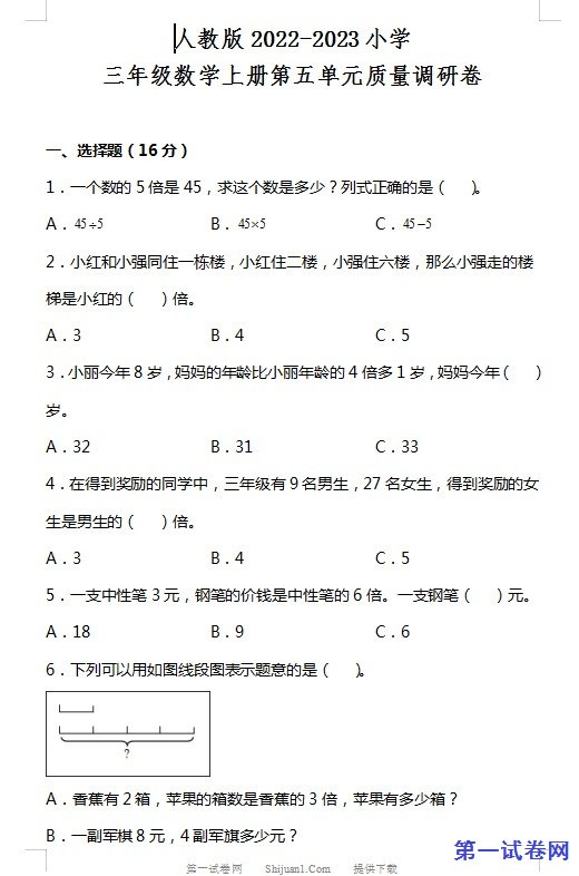 当前位置:免费教育资源网 → 下载 → 数学试题 → 初中与小学试题 → 小学三年级→ 人教版2022-2023三年级数学上册第五单元测试卷 免费下载