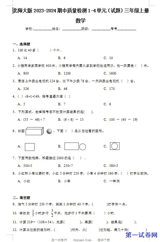 当前位置:免费教育资源网 → 下载 → 数学试题 → 初中与小学试题 → 小学三年级→ 北师大版2023-2024期中质量检测1-4单元(试题)三年级上册数学 免费下载