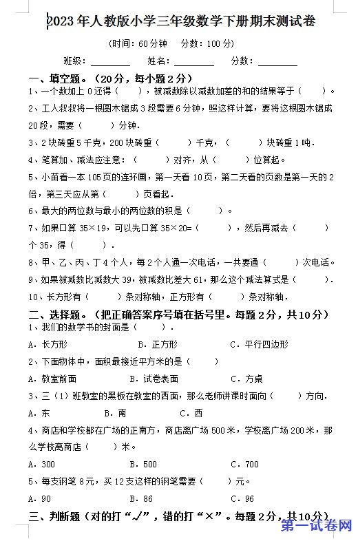 当前位置:免费教育资源网 → 下载 → 数学试题 → 初中与小学试题 → 小学三年级→ 2023年人教版小学三年级数学下册期末测试卷 免费下载