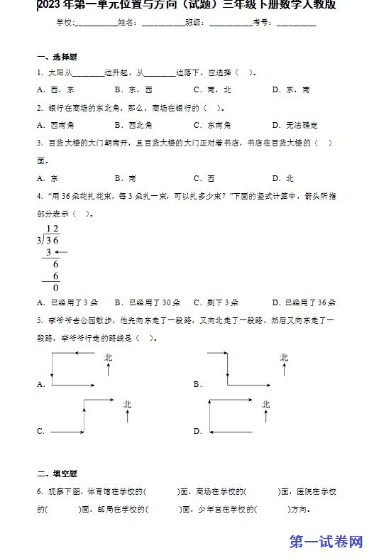 当前位置:免费教育资源网 → 下载 → 数学试题 → 初中与小学试题 → 小学三年级→ 2023年人教版小学三年级数学下册第一单元位置与方向 免费下载
