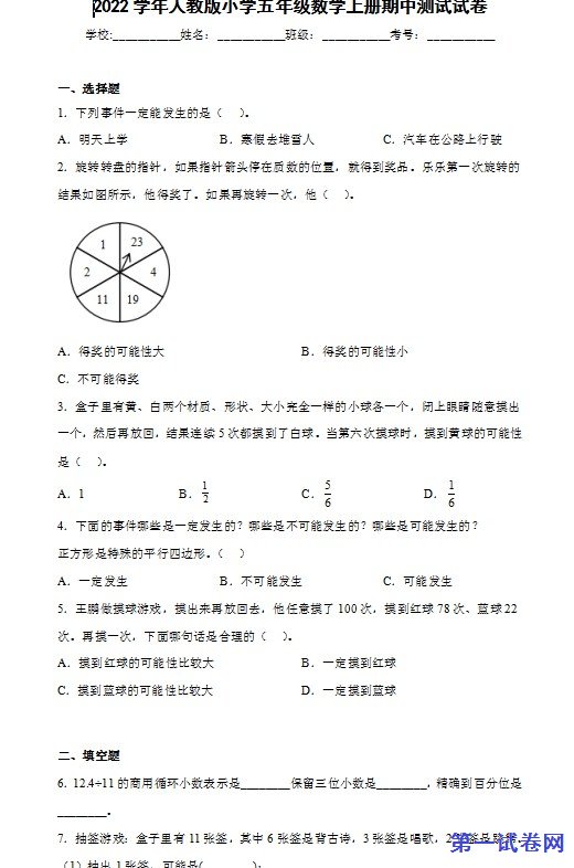 当前位置:免费教育资源网 → 下载 → 数学试题 → 初中与小学试题 → 小学五年级→ 2022学年人教版小学五年级数学上册期中测试试卷 免费下载