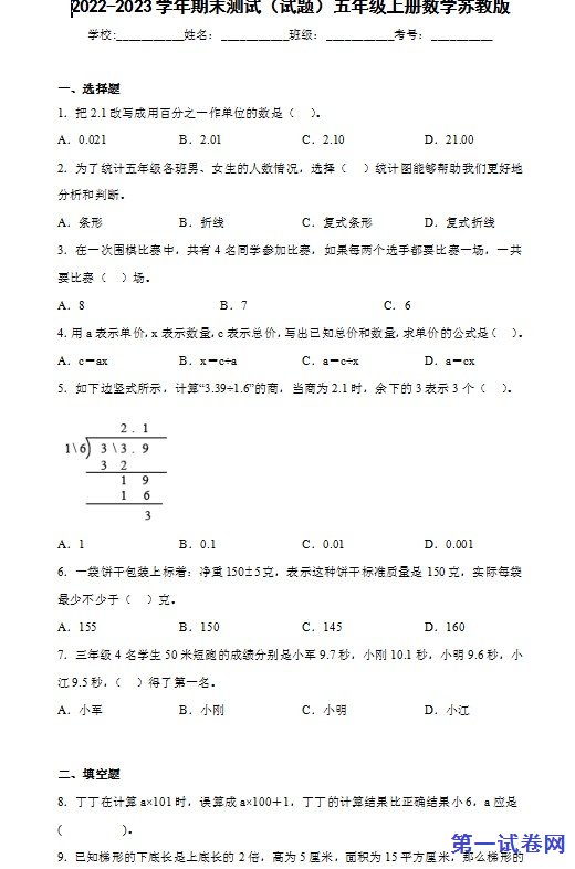 当前位置:免费教育资源网 → 下载 → 数学试题 → 初中与小学试题 → 小学五年级→ 2022-2023学年期末测试(试题)五年级上册数学苏教版 免费下载