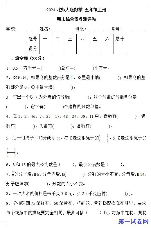 当前位置:免费教育资源网 → 下载 → 数学试题 → 初中与小学试题 → 小学五年级→ 2024北师大版数学五年级上册期末综合素养测评卷 免费下载