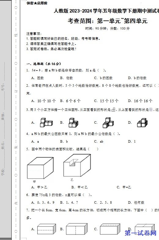 当前位置:免费教育资源网 → 下载 → 数学试题 → 初中与小学试题 → 小学五年级→ 人教版2023-2024学年五年级数学下册期中测试卷 免费下载