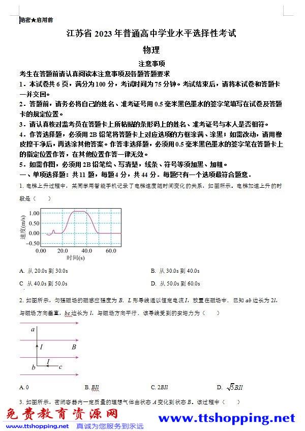 当前位置:免费教育资源网 → 下载 → 物理试题 → 高考试题→ 2023年高考江苏卷物理真题(原卷版) 免费下载