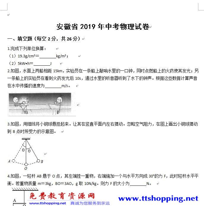 当前位置:免费教育资源网 → 下载 → 物理试题 → 中考试题→ 安徽省2019年中考物理试卷(word解析版) 免费下载