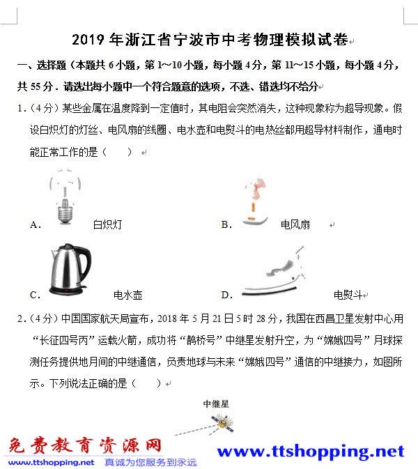 当前位置:免费教育资源网 → 下载 → 物理试题 → 中考试题→ 2019年浙江省宁波市中考物理模拟试卷(word解析版) 免费下载